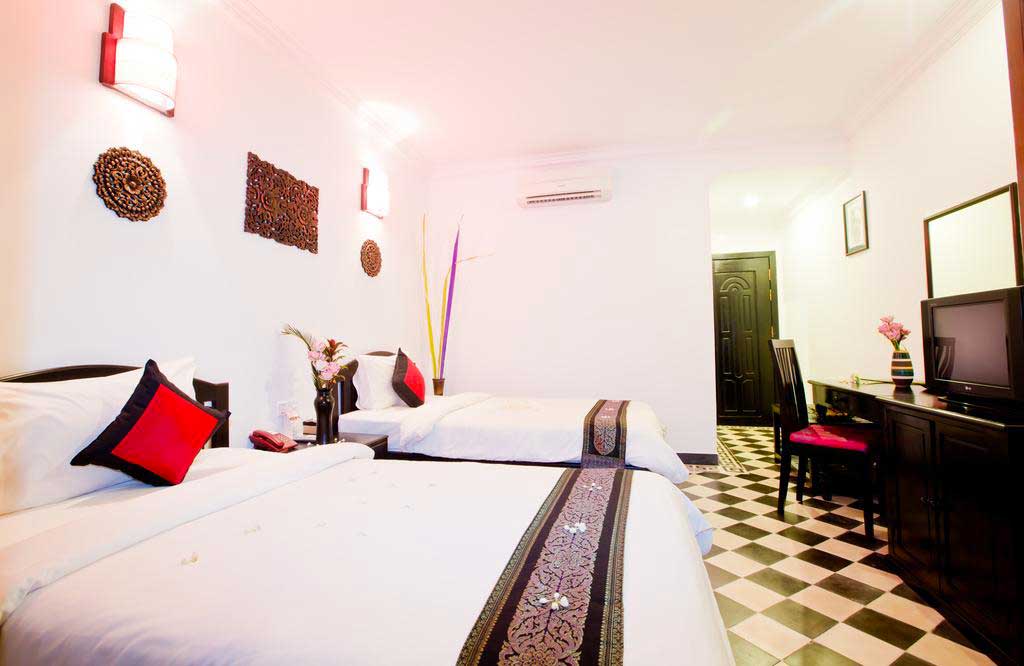 La Boutique Angkor est un hôtel 3 étoiles de 54 chambres. Très bien situé, il se trouve à 5 minutes de marche de la Pub Street et du marché de nuit, et en même temps en position tranquille, dans une rue secondaire.Les chambres de la Boutique Angkor sont confortables et spacieuses, sans luxe mais bien équipées avec la climatisation, la télévision, une salle de bain avec baignoire ainsi qu’un balcon privé donnant vue sur le jardin ou la piscine. L’hôtel dispose de 2 grandes piscines, une rareté parmi les hôtels de sa catégorie à Siem Réap. Le restaurant de la Boutique Angkor propose des plats asiatiques et européens.La Boutique Angkor met à votre disposition un service de location de vélos, change de monnaie, billetterie pour les sites touristiques aux alentours et un spa où vous aurez l’occasion de vous détendre au cours d’un massage.De plus, la réception de l’hôtel est ouverte 24h/24h.