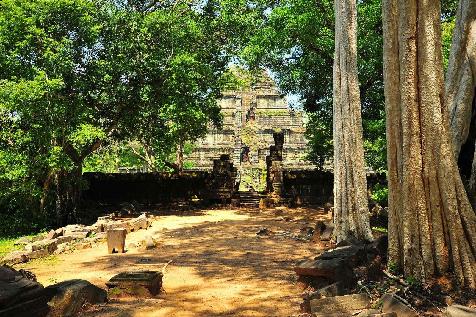 Koh Ker, ancienne capitale sous Jayavarman IV (début Xème siècle) est composé de nombreux sanctuaires plus ou moins espacés les uns des autres. Parmi eux, le Prasat Thom s’impose du haut de ses 30 mètres de haut et grâce à son architecture pyramidale aujourd’hui embrassée par les herbes.